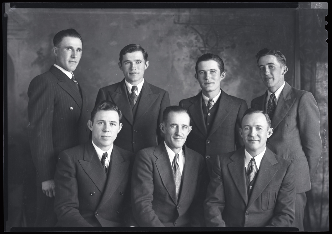 Summary: Back row: Heds, Amps, Joe and Red. Front row: Butch, Bill and Lawrence. Dressed in suits.