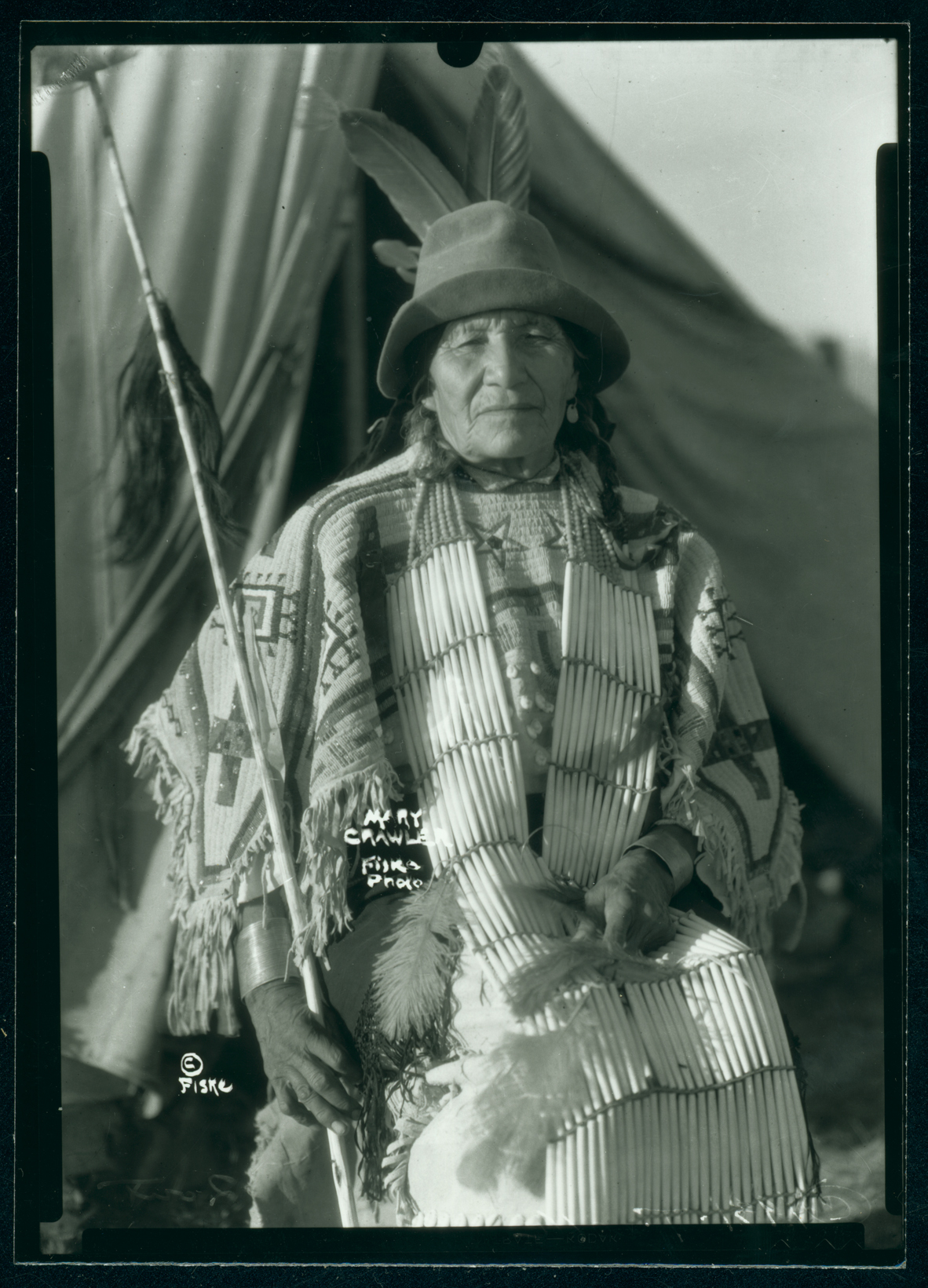 Summary: She sits in front of a tent wearing a men's hat with feathers, beaded shawl, and holds a flag.