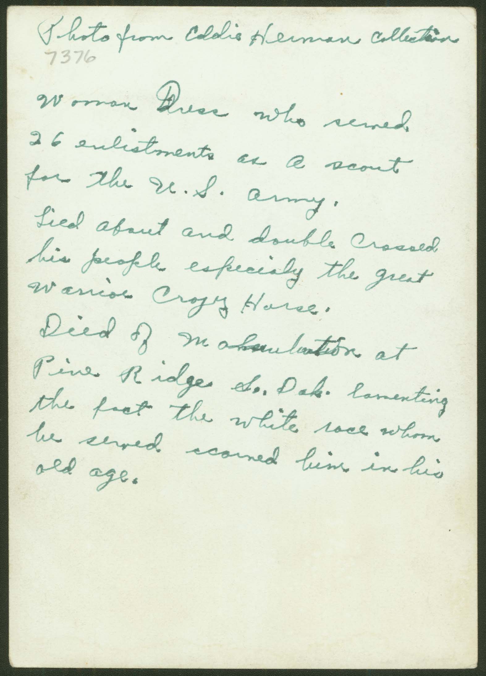 Summary: Studio portrait. "Photo from Eddie Herman collection. Woman Dress who served 26 enlistments as a scout for the U.S. Army. Lied about and double crossed his people especially the great warrior Crazy Horse. Died of malnutrition at Pine Ridge So.Dak. lamenting the fact the white race whom he served scorned him in his old age."