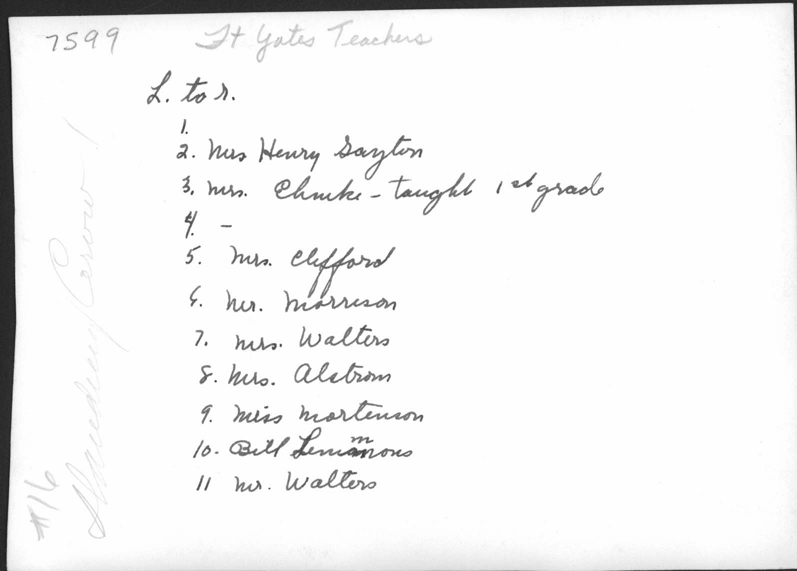 Summary: L to R: Unknown, Mrs. Henry Gayton, Mrs. Ehnike, Unknown, Mrs. Clifford, Mr. Morrison, Mrs. Walters, Mrs. Alstrom, Miss Mortenson, Bill Lemmons, Mr. Walters