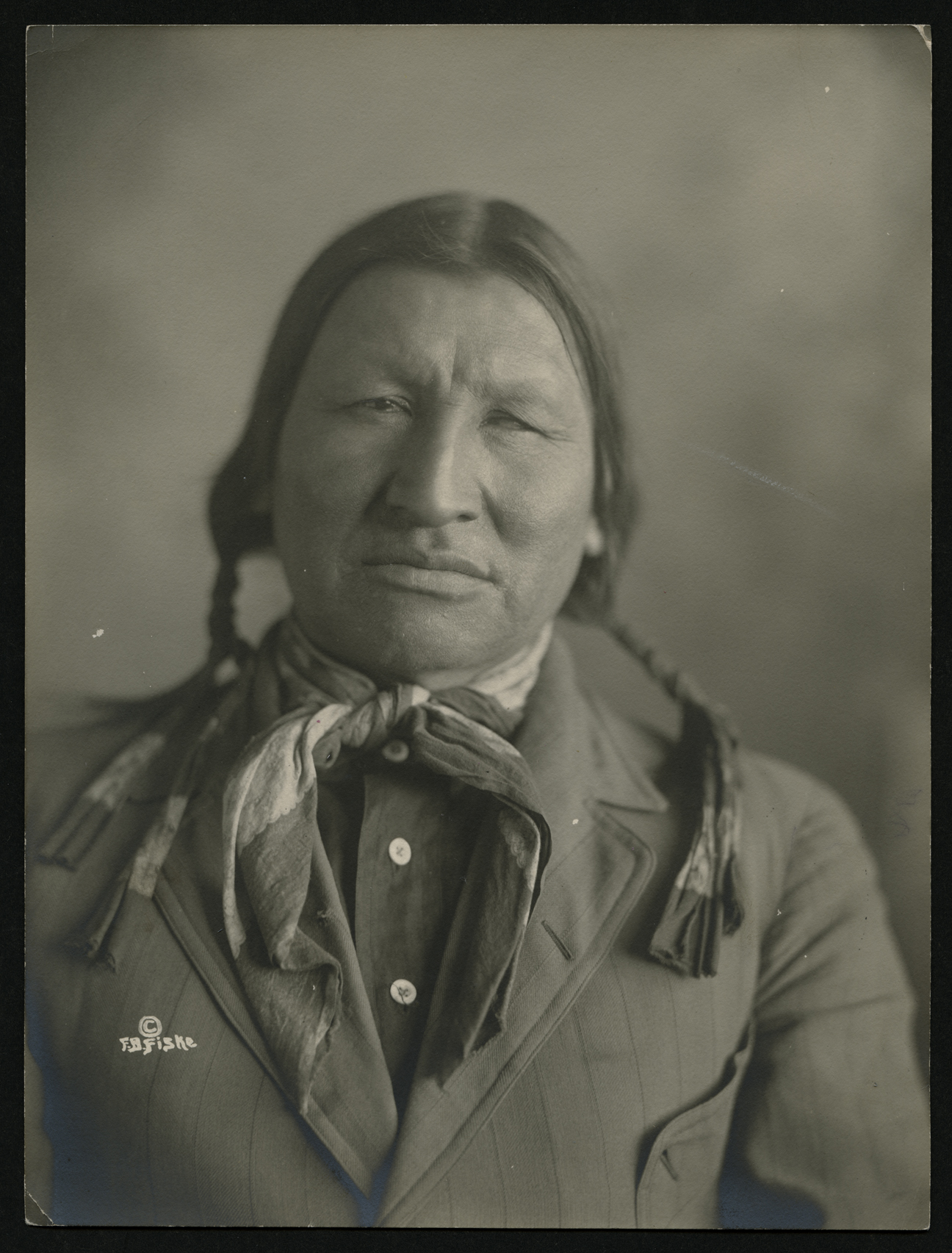 Summary: Includes prints and negatives of portraits, agriculture, education, wildlife, hunting, Frank Fiske studio portraits, and some views of South Dakota. Fiske’s Native American photographs include portraits, Indian gatherings and ceremonies, boarding schools, Indian houses and dwellings, and Native American agriculture. Fiske’s documentation of daily life on the reservation includes such shots as Sioux customers waiting for a Fort Yates trading store to open; a Sioux dance in the streets of Fort Yates; a plow issue before the agency boarding school; an encampment of tipis, including those traditionally painted; and three Indian men being taxied off the reservation to join the army in WWI.