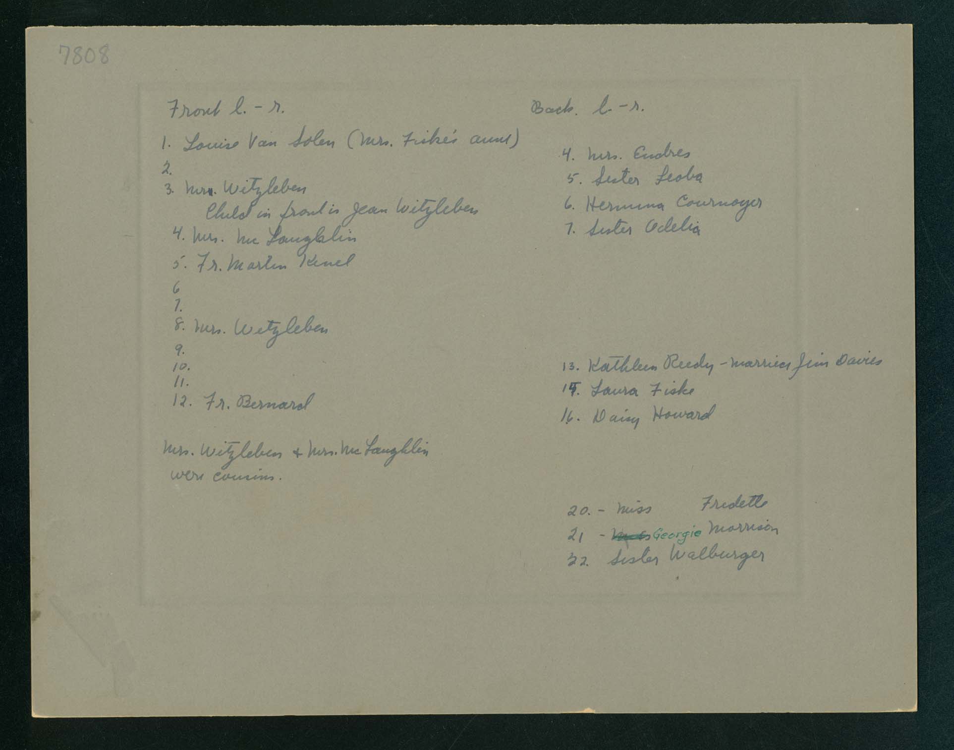 Summary: Front row: Louise Van Solen, unidentified, Mr. Witzleben with child Jean, Mrs. McLaughlin, Father Martin Kenel, unidentified, unidentified, Mrs. Witzleben, unidentified, unidentified, unidentified, Father Bernard. Back row: unidentified, unidentified, unidentified, Mrs. Endres, Sister Leoba, Hermina Cournoyer, Sister Odelia, unidentified, unidentified, unidentified, unidentified, unidentified, Kathleen Reedy, Laura Fiske, Daisy Howard, unidentified, unidentified, unidentified, Miss Fridette, Georgie Morrison, Sister Walberger.