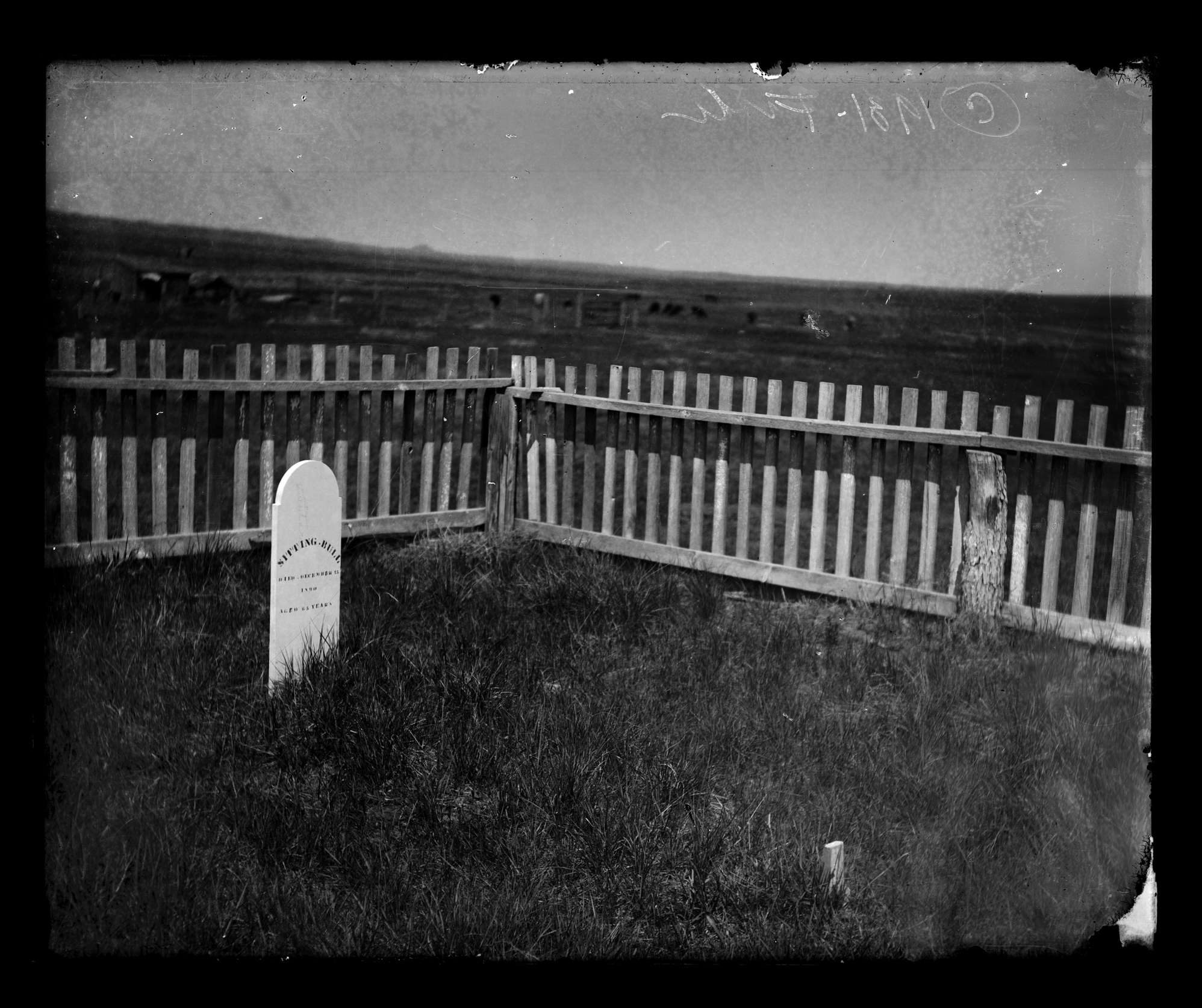 Summary: View of white stone gravestone enclosed by picket fence. Inscription on gravestone: “Sitting Bull Died December 15, 1890. Aged 63 Years” In the background are cattle grazing; A composite photo postcard consisting of three Sitting Bull related images: His grave at Fort Yates (1952-00054-01), a portrait of him and the site of his death. These were connected by decorative bead necklace, eagle feathers and an axe.