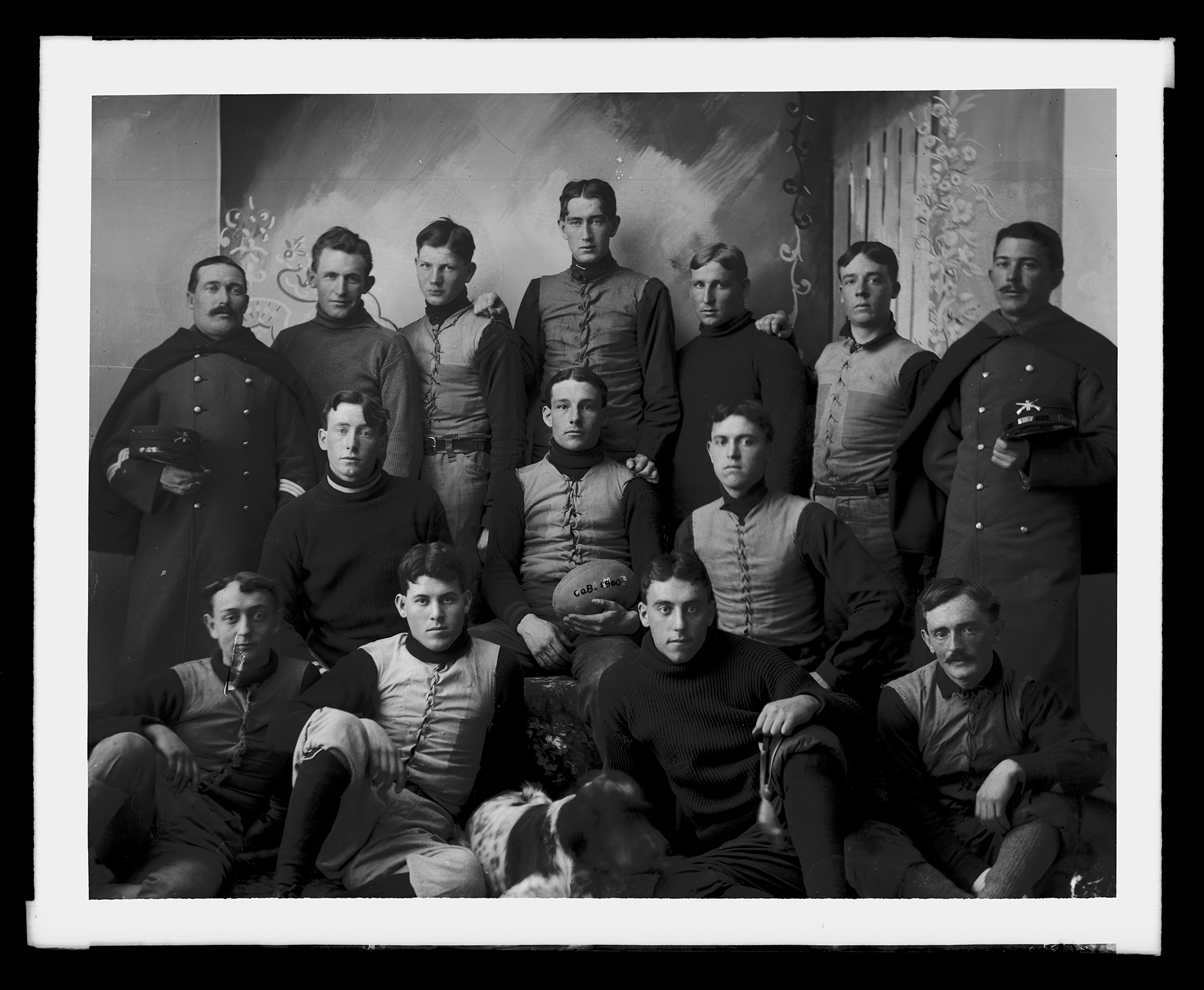 Three quarter length, full face studio group photograph of Regiment 5, Company B Football team. Most are dressed in football uniforms consisting of dark shirts under light coloured vests tied shut with cords and pants cinched just below the knees over knee high socks with lace up boots. Man in the middle is holding a football with the printed inscription of Company B 1900. The two men in the back row on the outside edge are wearing their army uniform and hold caps with crossed rifles with 5 above and B below the crossed rifles. The blurred figure of a dog is seated in the front middle of the group.