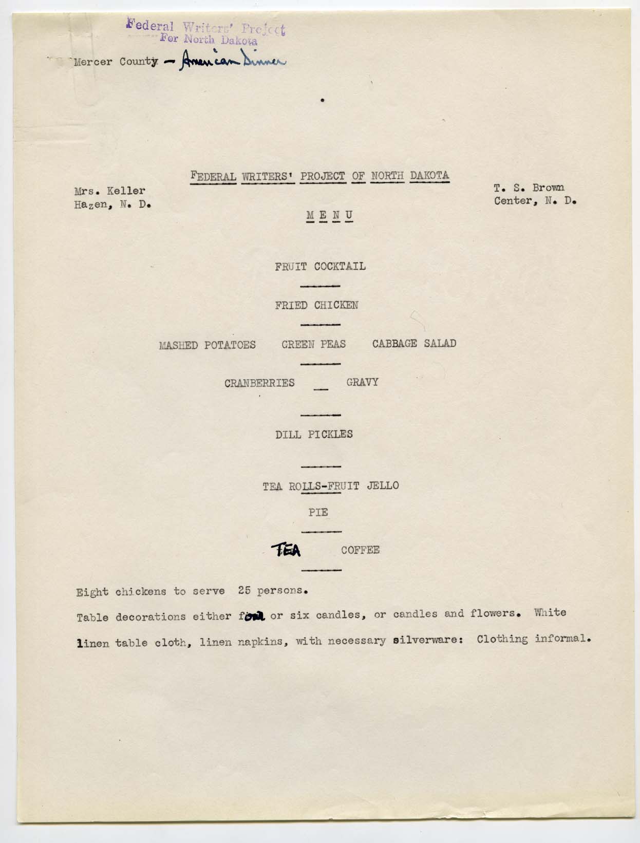 Title: Draft menu by Mrs. Keller, Hazen, Mercer County, and T. S. Brown, Center, Oliver County, North Dakota