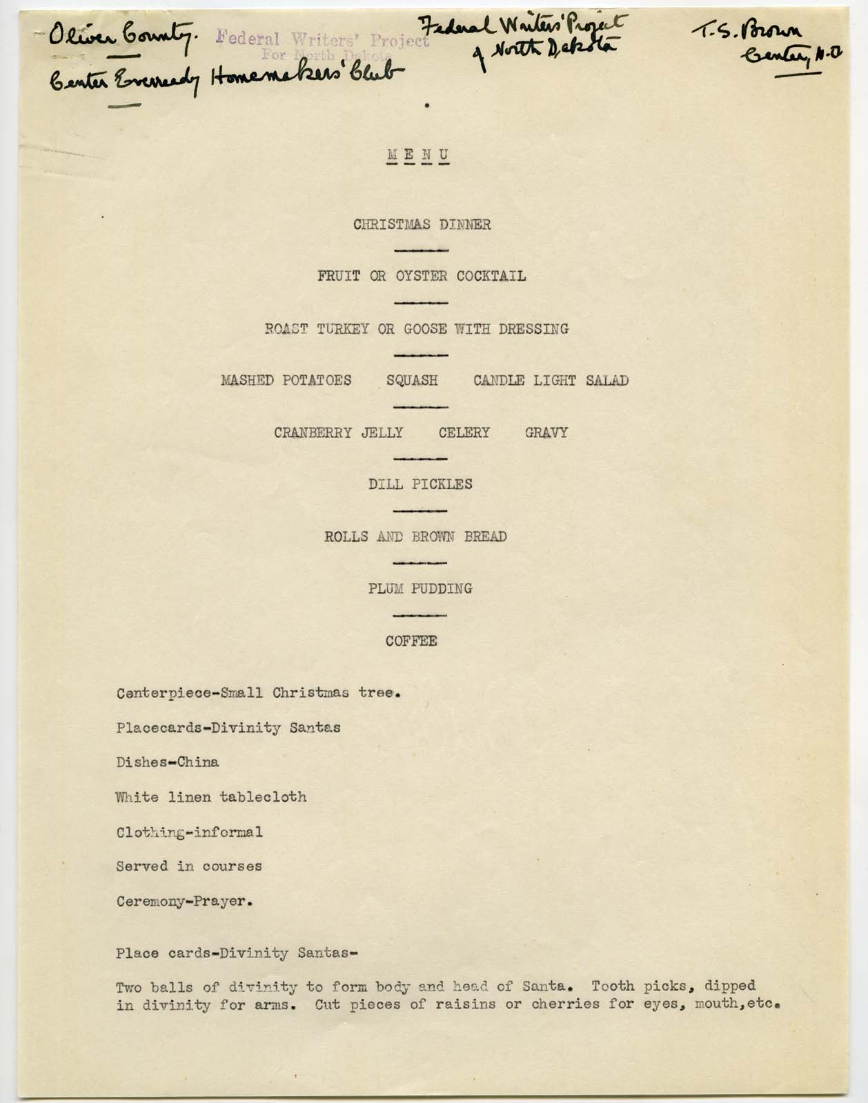 Title: Draft menu and recipe for Christmas Dinner, Center Everready Homemakers' Club, Oliver County, North Dakota, by T. S. Brown