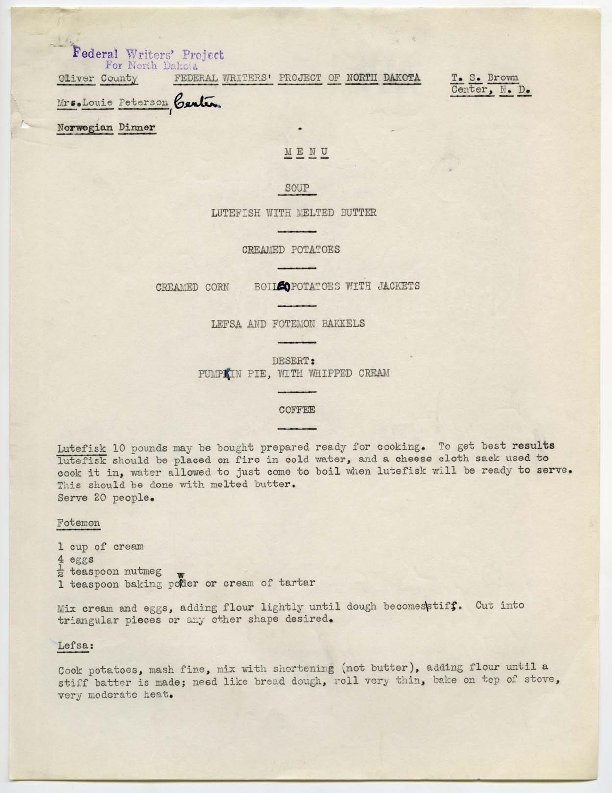 Title: Draft menu for Norwegian Dinner, Oliver County, North Dakota, by Mrs. Louie Peterson and T. S. Brown, Center, North Dakota