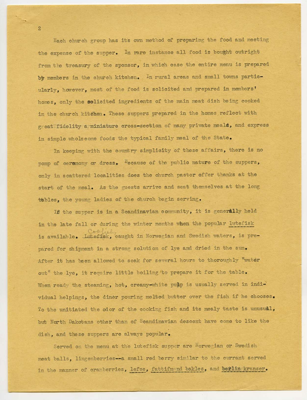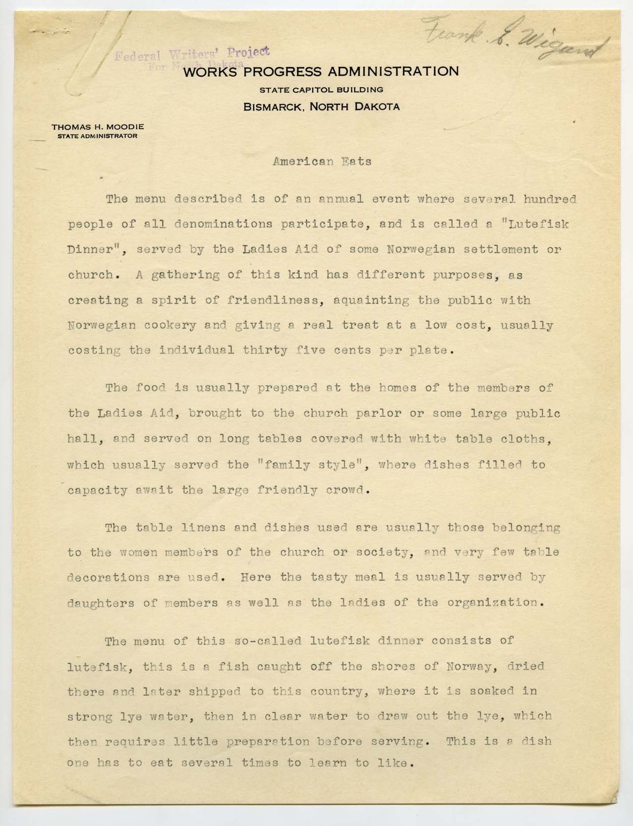 Title: Draft essay about a typical lutefisk dinner in North Dakota, by Frank