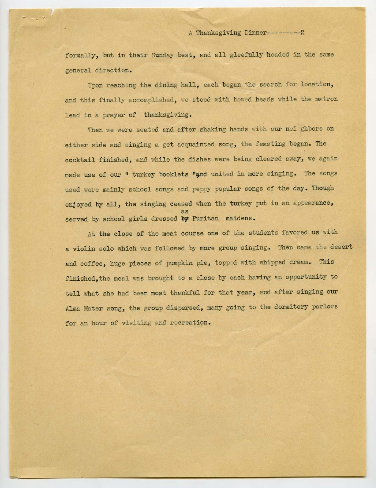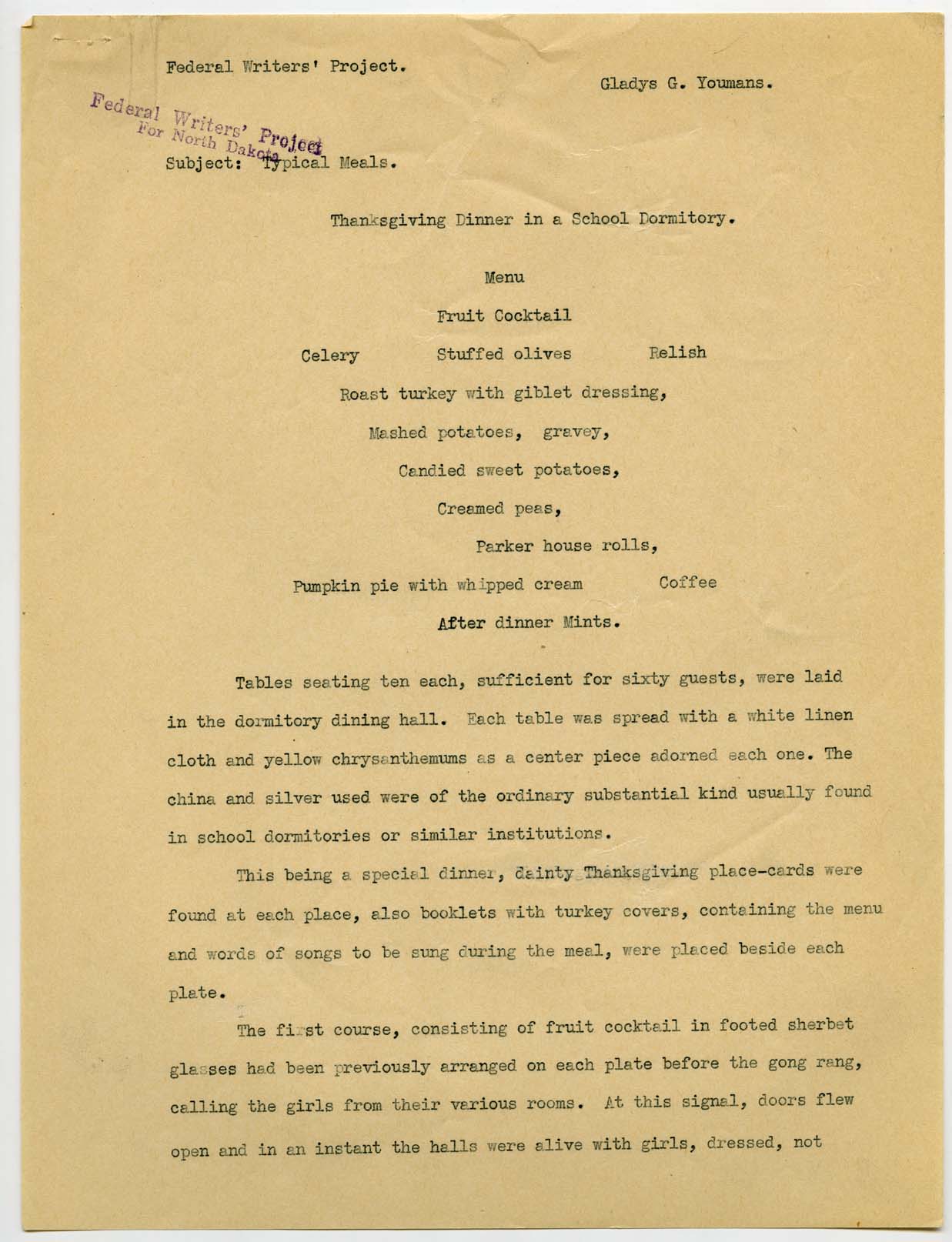 Title: Draft essay about Thanksgiving dinner in a school dormitory in North Dakota by Gladys G. Youmans