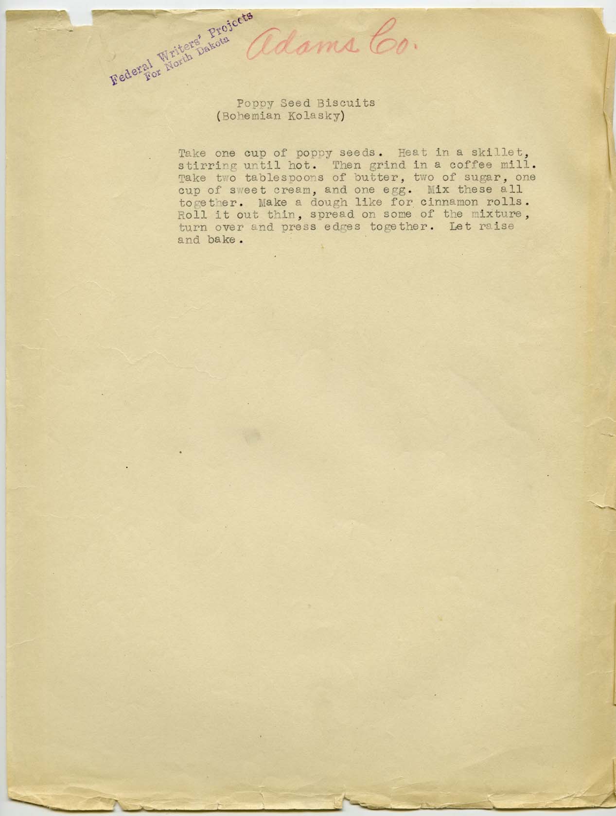 Title: Recipe for Poppy Seed Biscuits (Bohemian Kolasky), Adams County, North Dakota, author unknown